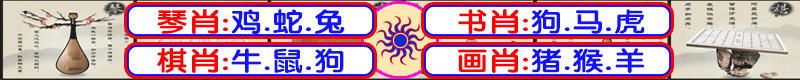 067期:琴棋书画【琴棋书】开:虎05对 068期:琴棋书画【画琴棋】开:猴23对 069期:琴棋书画【棋书画】开:羊24对 070期:琴棋书画【书画琴】开:马25对 071期:琴棋书画【画琴棋】开:羊48对 072期:琴棋书画【画棋书】开:鸡46错 073期:琴棋书画【棋画琴】开:發00对 (琴)鸡蛇兔(棋)牛鼠狗